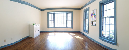 Whilst discussing office plans last week, a few of your comments about the blue trim situation in that room were the push that we needed. We were fooling ourselves to think we should paint all that trim by hand (we’re talking baseboards, crown molding, and five windows totaling 66 individual panes). So we decided to bite the bullet, break out the paint sprayer, tape everything off, cross our fingers and toes that we didn’t get any bleed-through on those wood floors, and say hasta la vista to some more blue trim this weekend.