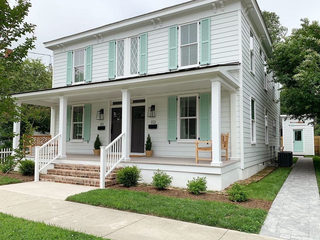 And here’s a similar after shot. You can see some of the old features that we saved/restored, like the diamond gridded windows, the corbels below the roofline, and the original front doors. Plus we added some nice wide brick steps, porch columns that no longer blocked the windows (this is much more likely their original position), and a tin roof that made it even more welcoming.