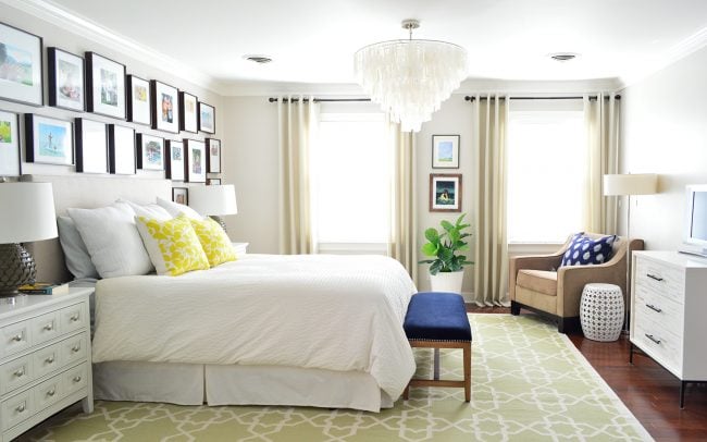 We mentioned some recent bedroom movin’ & shakin’ on this week’s podcast, so we thought a post full of photos was in order for anyone wondering how it’s looking these days. Pretty much everything in our bedroom was purchased while we were living in our second house, so after moving here in 2013 stuff just kinda landed where it landed and whoop, there it was. We painted. We hung frames. We made a few sporadic dresser swaps, and then we repainted. But the anchor pieces like the rug, the bed, the armchair, and most of the other furnishings pretty much remained the same. More recently we got a super on-sale chandelier and swapped beds with the guest room and it felt like the room was nicely settling into feeling “nearly-done.” Basically, we were fully expecting to go back to ignoring this corner of the house for at least a few more years.