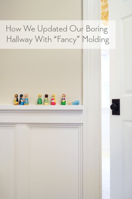 The project was easy, but somewhat tedious because of the size of our hallway. But it could easily be knocked out in a day or two for smaller spaces like bathrooms or dining rooms. So we’re gonna fast forward through all the miter cutting, nailing, caulking seams, filling nail holes, priming, and painting and – VOILA! Cue the (caulk-covered) high-fives.