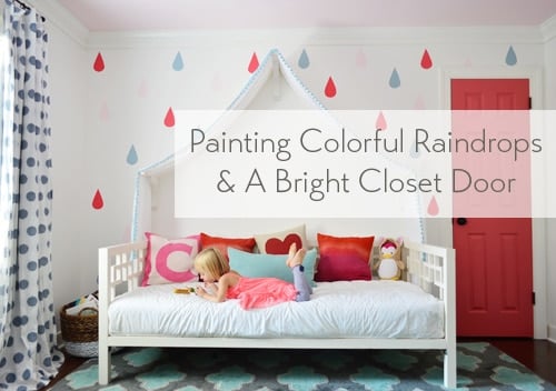 Let’s all join hands and sing “Raindrops & Rose Paint.” Yes, that’s a bad Sound of Music pun. Please forgive me, Julie Andrews. But just look at how festive Clara’s room is thanks to the addition of some bright raindrops that we painted on the wall and a watermelon pink closet door.