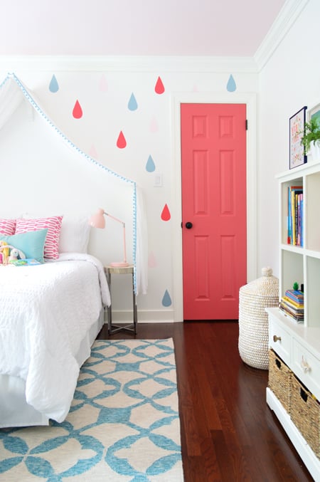 Then came the crown molding that we installed (here’s how we made it extra beefy), along with a bold pink closet door and some colorful raindrops on the wall, just for fun (here’s the full rundown on how we did that with paint colors, steps, etc).
