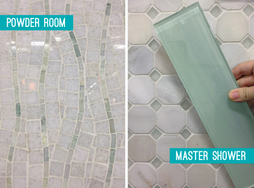 The floor tile in the shower pan is the Tile Shop’s Evanston series in Frost Snow, which featured some small aqua glass accents between the marble squares which help tie the big accent wall together with the marble floor (that’s 12 x 24″ Tempesta Neve marble) throughout the rest of the room. You can check out a detailed photo of our tile pics (and more clearly see those little green glass squares in the floor) here. We also really like how the tile installer wrapped the white subway around the shower threshold.