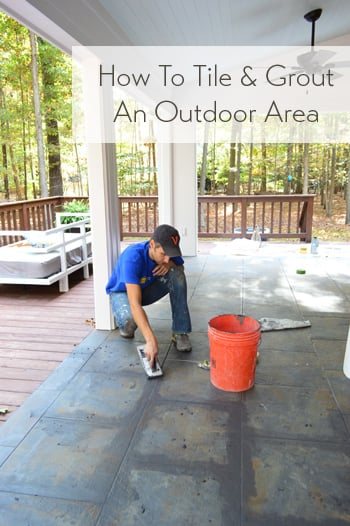 In the end, we’re really happy with our slate-like porcelain tile choice. Even when it’s wet it’s not slick like the smooth concrete floor used to be, which was a major concern of ours, and we also like how it goes with the deck and how the tile border that we added really elevates the look (more on how we planned that border here). My original hope was to grout a day or two after finishing things up out there, but Sunday was a wash because I could barely move (thanks to so much lifting, bending, hunching over the day before) and Monday was literally a wash because of rain. As was Tuesday, Wednesday, Thursday, Friday, Saturday, and Sunday of that week.