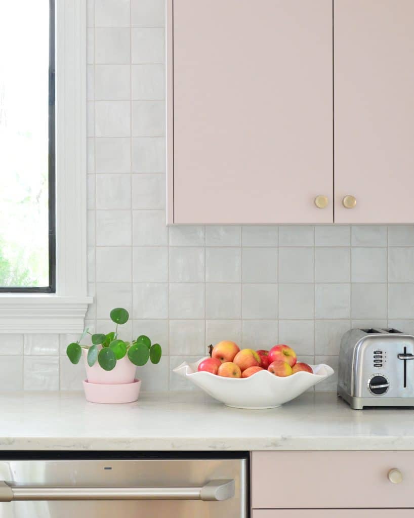From the subtle backsplash (Sherry describes it as: “a pearly-blue color that feels perfect for the beach – like the inside of an oyster shell”) to the classic marble-like quartz counters and the mauve color that we brought over to the new cabinets (which has always been in this room and feels meant to stay) – we really like where we ended up. The cabinet color is Artsy Pink by Sherwin Williams by the way.