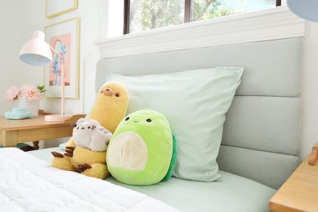 After using our favorite method to make a simple headboard for our son’s room last week, we actually had enough leftover materials to try out a new trick in our daughter’s room – which yielded a completely free headboard for her. Three cheers for $0 projects, right? Especially since she helped us settle on the design and make it, so it’s not only cozy to lean back on (you know that function is my love language), but she’s also super into the finished result because she had a hand in it. Literally.