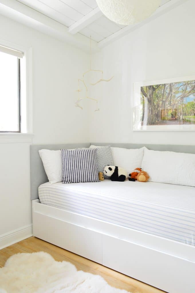 Every bed looks better with some sort of headboard, and this wraparound style is great for a daybed. It’s two separate pieces across the head and back wall. We didn’t need a third because we built a DIY bookshelf at the foot. But you could easily add a third panel. Plus you can make them any height and use any fabric that you’d like!