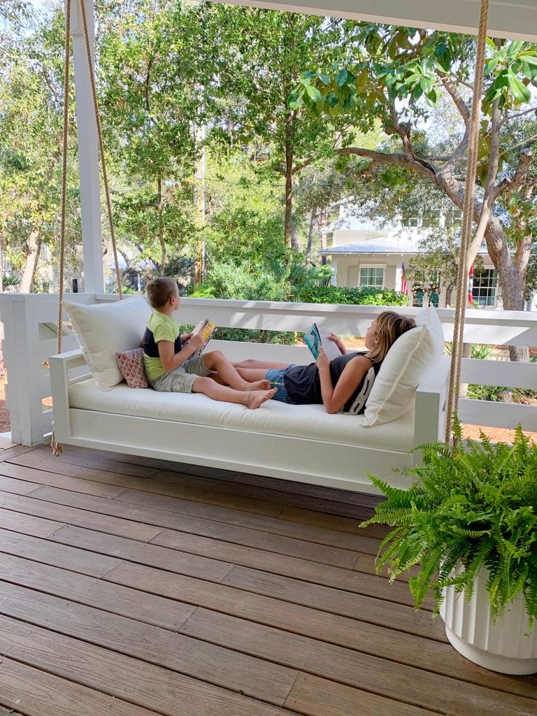 Back in October we mentioned our plans to add a hanging daybed to the covered portion of our front porch and our entire family couldn’t be more excited that it’s finally done.