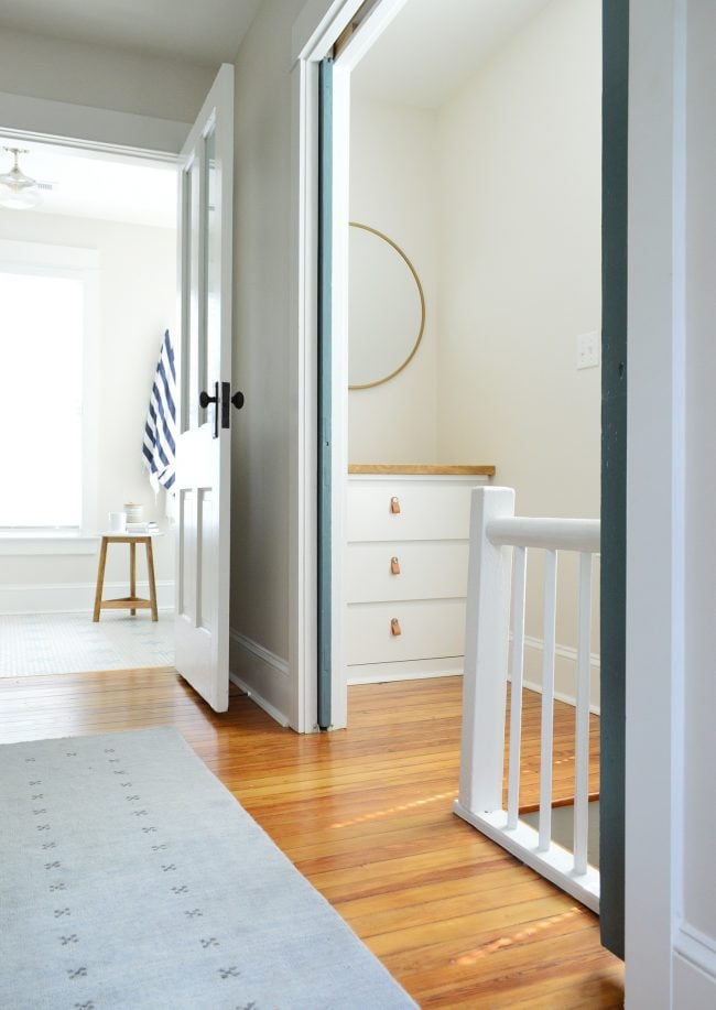 This is actually the main clothing storage for the back bedroom at the beach house (the one we stay in whenever we’re there) and it has been working out so well to have a dresser tucked back there now. Originally this room was completely open to the back staircase… meaning it was completely open to the kitchen downstairs (you could hear everything and anyone could run up without encountering a closed door).