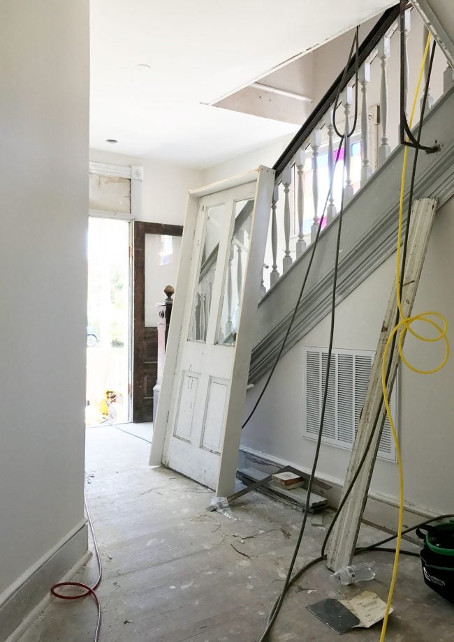 Also, it’s actually really fortuitous that they didn’t prime and paint everything white before it went back up, because seeing some of these muted colors on the trim – specifically the soft gray color on the front stairs and the pale blue-gray color around the doorway in the above photo made us second guess our original instinct to paint all of the trim white. I know, you’re shocked because our middle names could be “Bright White Trim” but it’s true. You can hear more about what we’re thinking in Sherry’s video, but we’re toying with color matching those two tones and using them in some spots around the house.