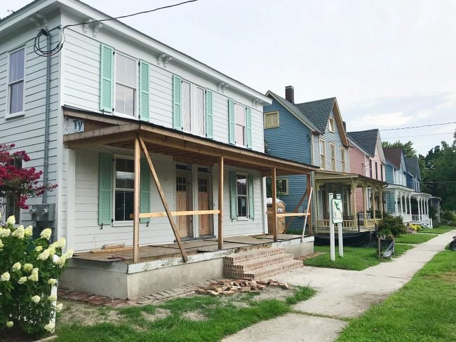 The shutters ended up being a bigger ordeal than we expected. New historic mandates require that the shutters appear to be operable, meaning vinyl shutters that you can pick up for about $60 a pair and screw right into the siding weren’t an option. The requirement is based on them wanting an authentic look and not based on function. Nobody actually closes their shutters there for storms – and many houses, including our pink house, don’t even have them at all! Most houses that do have them are those non-operable vinyl shutters that were hung before the mandate (like the periwinkle blue ones that used to be on the duplex). We actually get worse storms in Richmond, where we also don’t have operable shutters… ha!