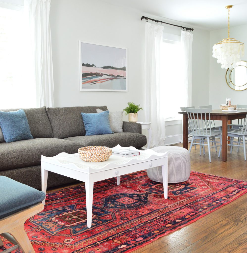 So here we are back in the present. You can see from this angle that it’s all nice and open, but we made sense of the long room by giving it both a living and a dining function. If you have a long open space like this, one tip would be to use area rugs and hanging lights to define different zones so it doesn’t look like one long bowling alley of a space. Floating furniture around the rug to make a living room “zone” at one end, and then hanging a pendant to define the dining area so we could center a table and chairs beneath that chandelier were two good ways to keep the room from feeling like a big amorphous blob.