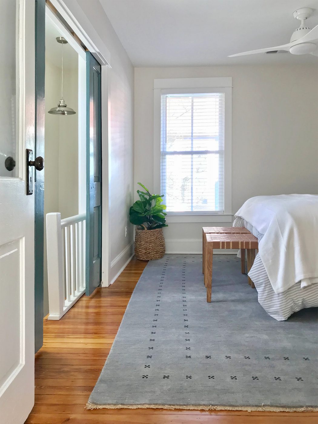 - We used this same trick in the pink house, but by pulling the bedroom door into the hallway a little bit (in this case to line up with the linen closet door) it creates a “vestibule” for the inswing of the door. Since the bed will likely go on that right wall (facing the window bench) this means the door doesn’t open right into the nightstand.