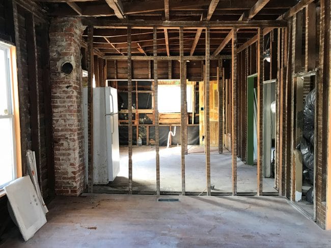 If you’re new around here or aren’t sure what we mean by “the duplex,” you can catch up on everything in detail here. But the short version is that it’s a rundown duplex that we bought last fall to renovate and turn into a weekly vacation rental. It’s just one house away from our pink beach house in Cape Charles, VA, which is located on the Chesapeake Bay of Virginia’s Eastern Shore. So far it has just been gutted and once the weather starts cooperating, we’ll finally get to start rolling on exterior improvements like a new non-leaking roof and some new not-rotten siding.