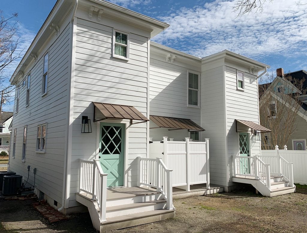 Yes, that picture above was what the back of the duplex looked like when we bought it: rotten siding, rickety railings, cinderblock steps, strange old vents and wires, inoperable HVAC systems where our outdoor showers now reside. And lower-level bump-outs on each side where the old kitchens used to be (one actually had a toilet just sitting right next to the back door without any walls closing it in… about two steps from the kitchen sink).