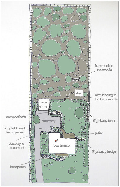 Letty- The story about the drawing is that we both made it together. Romantic, eh? Or dorky. You decide. John traced the to-scale property sketch from our closing file and added things like the driveway and the patio which weren’t in it (he’s much better at scale and layout than I am). Then I traced all of his pencil marks with a pen, added some bushes and trees, scanned it into the computer, and brought in some color (and the typed labels) in Photoshop. Glad to hear that the group effort fried your bacon!