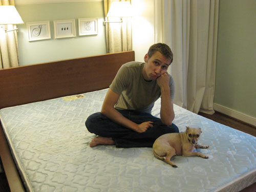 Ok, we’ll let you in on a small semi-gross secret. Our master bedroom mattress was way way old. Hugh Hefner old. And it was a hand-me-down. In fact, John’s sister graciously donated it to us when we moved to Richmond three years ago (after decades of use with it herself). They say mattresses get stiffer with age and we can definitely vouch for that fact. Ours was as tough as a brick and about as comfortable as one too. But it certainly did the job over the past three years and we weren’t in any place to purchase a new one off the bat as we embarked on our extreme home makeover one room at a time. Paint, primer, other furnishings and accessories- even a kitchen remodel- came first. And every night we retreated to bed sore and tired and woke up more achy than the night before. Here are John and Burger demonstrating how not fun our old mattress was. Look at those sad faces.