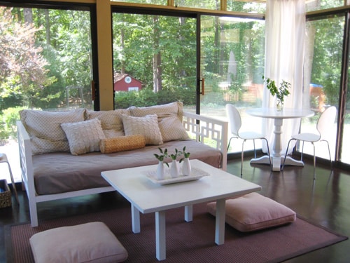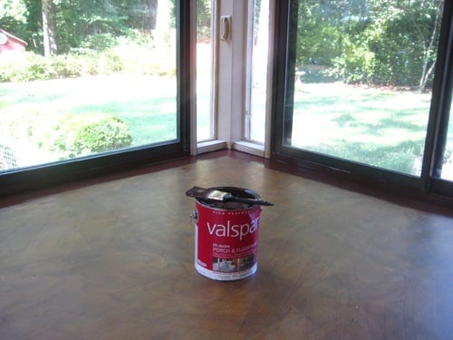 I love your floor, my husband and I actually just refinished the hardwood in our house a dark brown color, but refinishing was back-breaking work, and we don’t have the energy to put all of that into our bedroom wood floor, although it needs serious help. We were thinking about painting the floor the same color you used in your sunroom, but I’m not sure if that will look good or not…It looks great on yours, but do you think it would look equally good on wood or would that be a major mistake?? We can’t really afford putting in carpet right now, and this seems like the most feasible solution.