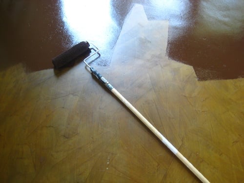 Step 3: Use a paint roller with an extended pole attachment to coat the entire floor with one coat of paint. Roll in long even strokes and make a “w” pattern on the floor with the roller to eliminate any obvious paint globs from the side of the roller. Don’t forget to be smart about painting yourself out of the room as oil paint takes a looong time to dry before you can walk on it again.