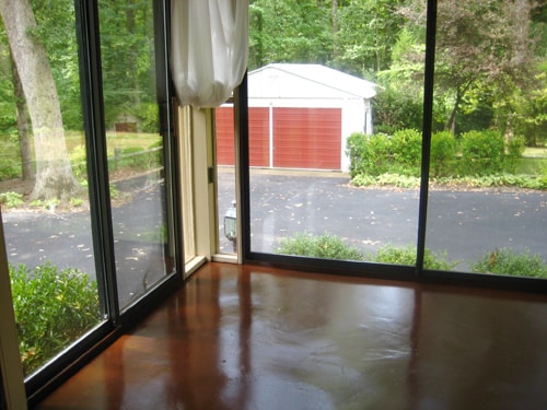 Our recent sunroom floor staining debacle led us away from semi-transparent floor finishes (which are fabulous for raw concrete but don’t work as well over previously stained concrete) and towards solid floor treatments that are yummy and glossy and opaque. So here’s how we got it done.