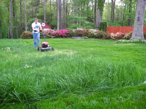 After overseeding the yard and tossing down some fertilizer to get things going, we quickly found ourselves with a full fledged jungle on our hands after a long span of rainy days.