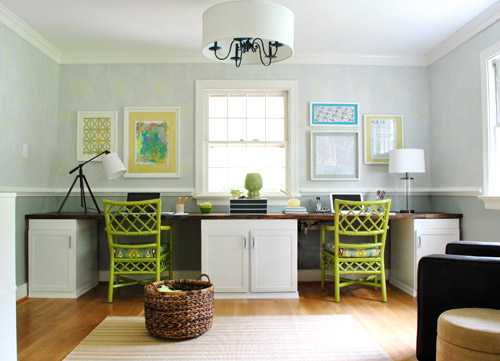 Thanks Kate! One of the challenges with sharing stuff on a blog is that unlike a makeover show, it takes months and even years to get to the after! So a lot of people have no idea what’s going on in the middle part (especially us sometimes- hahah). We just take it one day/project at a time and build as we go! Those chairs looked crazy at first to some folks because the rest of the room was sooooo neutral (gray walls, white trim, white desk, white file cabinet, wood desktop) – so when they were added without art and accessories and all that good stuff they definitely stuck out a lot more instead of tying in!