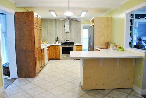 Congrats on the new counters! Looking good! But the lights and the ceiling fan really sting the eye now… can’t wait to see those replaced.
