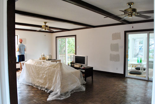 So the next thing on our to-do list is to paint the trim & baseboard in the living room (which is why the furniture is staying in a nice little island formation in the middle of the room until that’s done). Oh and we’ve decided to leave the ceiling beams unpainted for now. We’re definitely gonna see what the rest of the room looks like before making any decisions about what to do with those. Sherry has this crazy new idea about staining or painting them a rich charcoal color. Could be cool. And we’ll probably photoshop it before taking the plunge and share the madness with you. But before we get to that we’ll hopefully have the finished trim pictures to share next week. Fingers crossed for record-breakingly-fast painting luck and another one of those Naps To End All Naps from Clara.