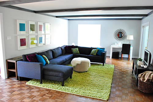Oh and before I forget, do you see the white fabric around the middle console piece in the pic above? That was just an extra sheet that we had which Sherry stapled neatly around the entire wooden frame to create a nice little fabric compartment so nothing that we attempt to store can slyly slip behind the sofa. Then those two baskets that you see stacked on the chair (that we also already owned) can be contained inside the fabric “box” for storing everything from board games and books to remotes and other stuff that you might want to put on a coffee table (since we have an ottoman instead). More pics of that in a minute.