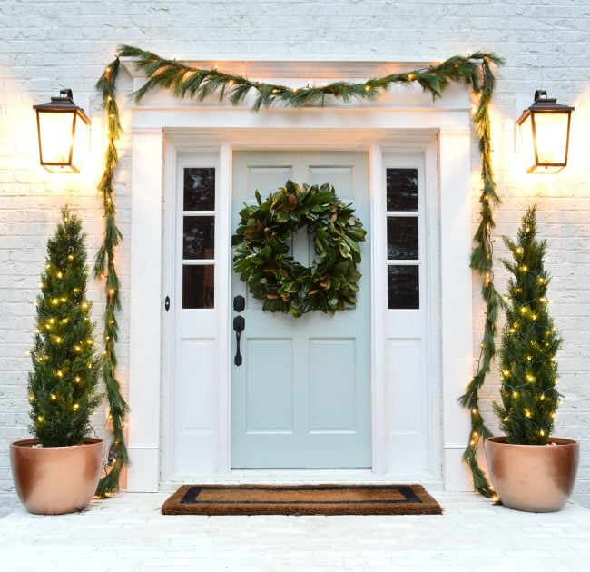 We did some simple warm white exterior LEDs (why are those so hard to find?!) on the trees on each side of the door. Remember I upgraded those to these larger faux ones because I can’t kill them and the taller height looks nicer on the porch with all the white brick. Those pots are actually the same ones we have had for 4+ years… I just spray painted them “Copper Rose” by Rustoleum (built in primer for the win – took about 30 minutes tops). Oh and we switched out the lights by the door for these slightly wider & bigger ones.